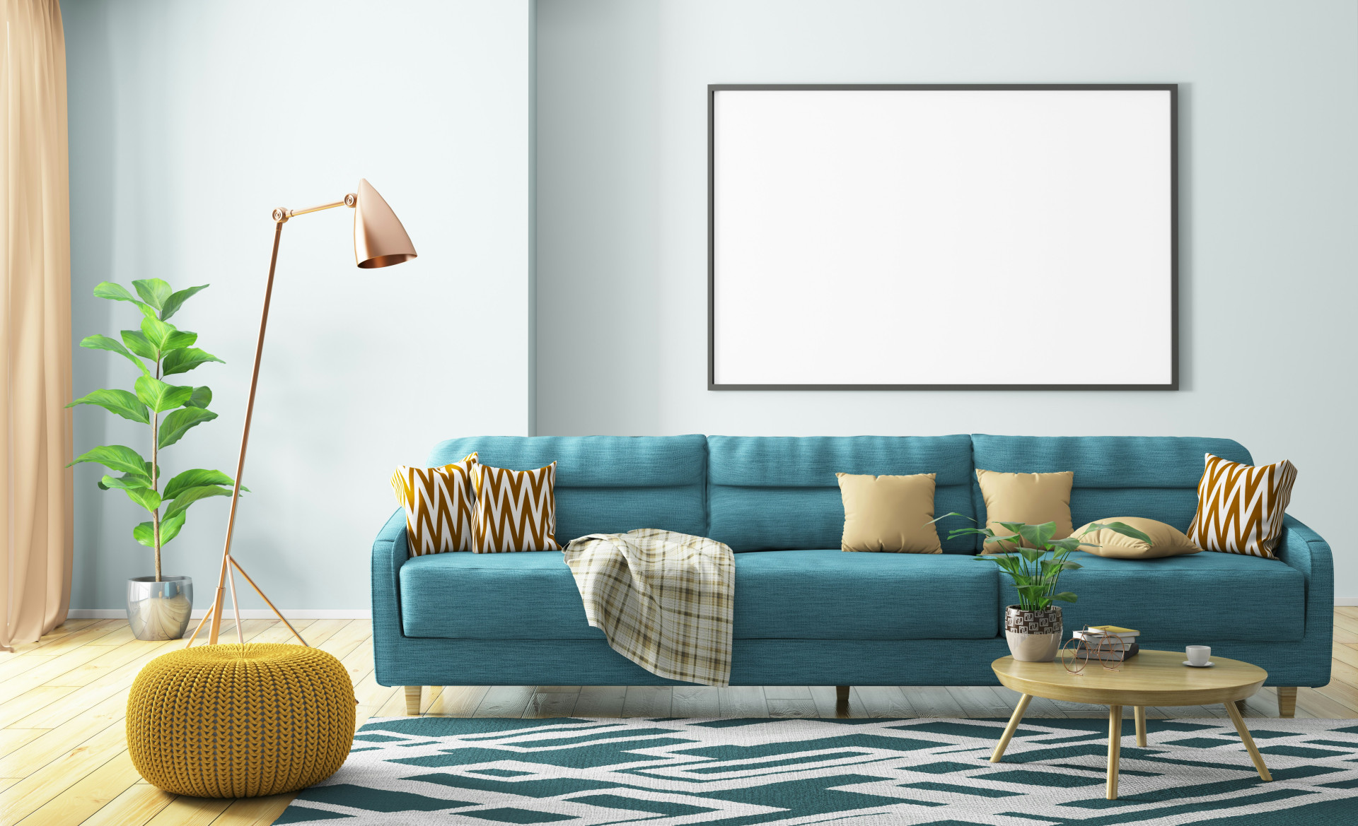 Et stort gulvtæppe under sofaen kan for eksempel samle farverne i rummet og give en visuel base. Vælg et tæppe, der enten matcher sofaens farve eller står i tydelig kontrast – afhængigt af, om du ønsker ro eller energi i indretningen.